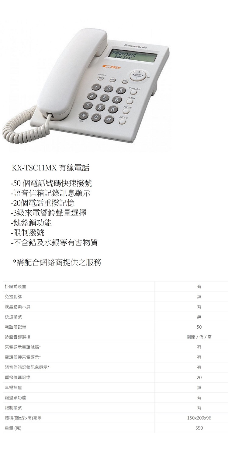 -語音信箱記錄訊息顯示-20個電話重撥記憶-3級來電響鈴聲量選擇-鍵盤鎖功能-限制撥號*需配合網絡商提供之服務
