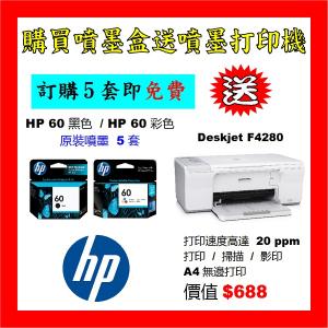 買噴墨送HP Deskjet F4280打印機優惠 - HP 60黑色   60彩色  原裝  Ink 5套