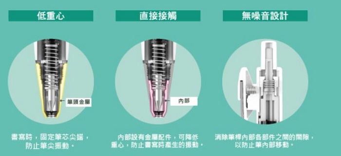 無噪音設計:透過消除零件之間的縫隙,有效防止筆內晃動。