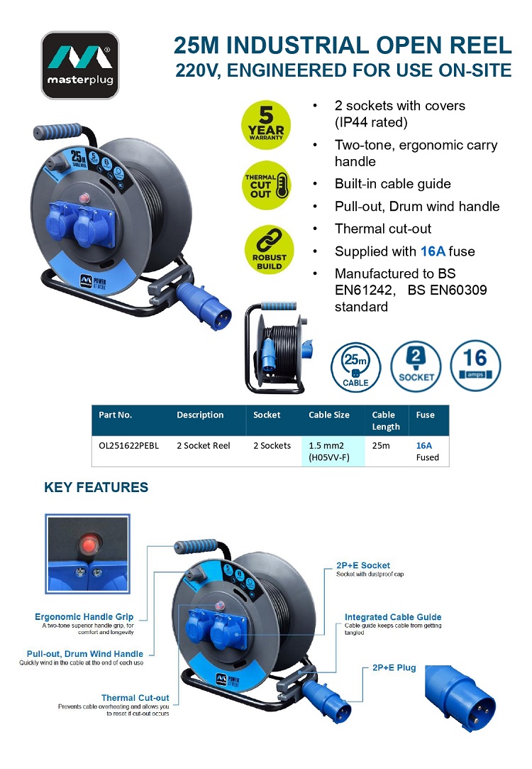 規格參數產品特色 原裝行貨,5年保養 符合人體工程學的提手 內置電纜導向裝置 拉出式,鼓風手柄 熱切斷功能 - 防止過熱,並允許發生斷路時重置 規格: 2 個帶蓋插座 IP44 等級 提供 16A 保險絲 按照 BS EN61242、BS EN60309 標準製造 政府部門可用"P"卡付款,